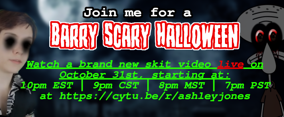 Join me for a party on Halloween ![]() A Barry Scary Halloween is a new skit, semi based on true events. I would be honored if you spent your Halloween with me on my Cytube as I premier the video live. It's not like you have anything better to do. There's a livechat, no account needed, and you can add videos to the roster before the premier. The new video starts at 10 PM EST | 9pm CST | 8pm MST | 7pm PST. After the video we will watch a b-movie together. Go to the Cytube on October 31st at 10 PM EST | 9pm CST | 8pm MST | 7pm PST. --------------------------------------------